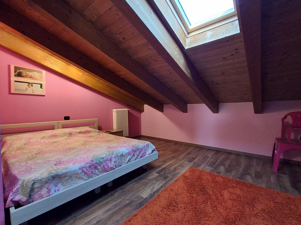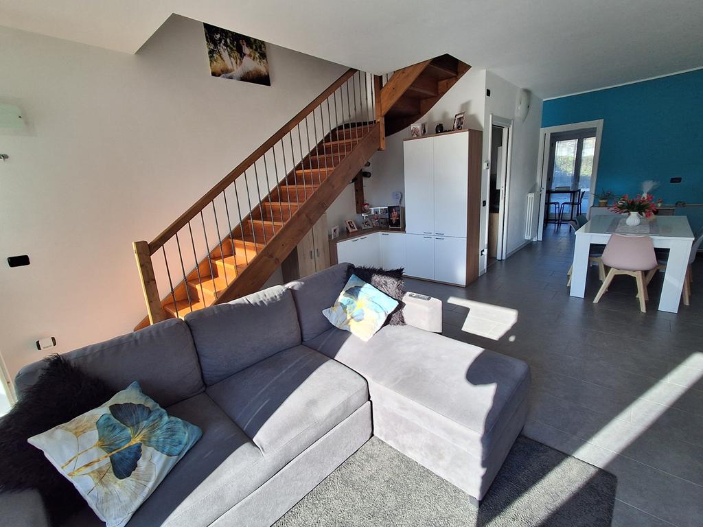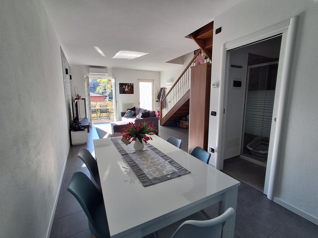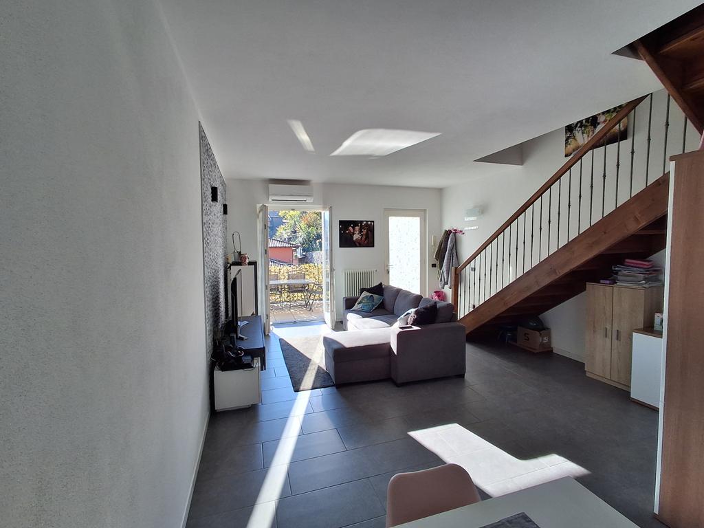 The apartment is spread over two levels. On the mezzanine floor, there is a bright living area with an open-plan kitchen, a guest bathroom, and a large terrace of approximately 20 square meters, perfect for outdoor dining or enjoying pleasant summer evenings with friends, while admiring the splendid view of the lake and surrounding mountains.