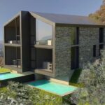The modern stepped design, stone-clad walls and red maple wood finishes, together with wisteria plants climbing along walls and pergolas, make the complex perfectly harmonized with the surrounding environment throughout the year.