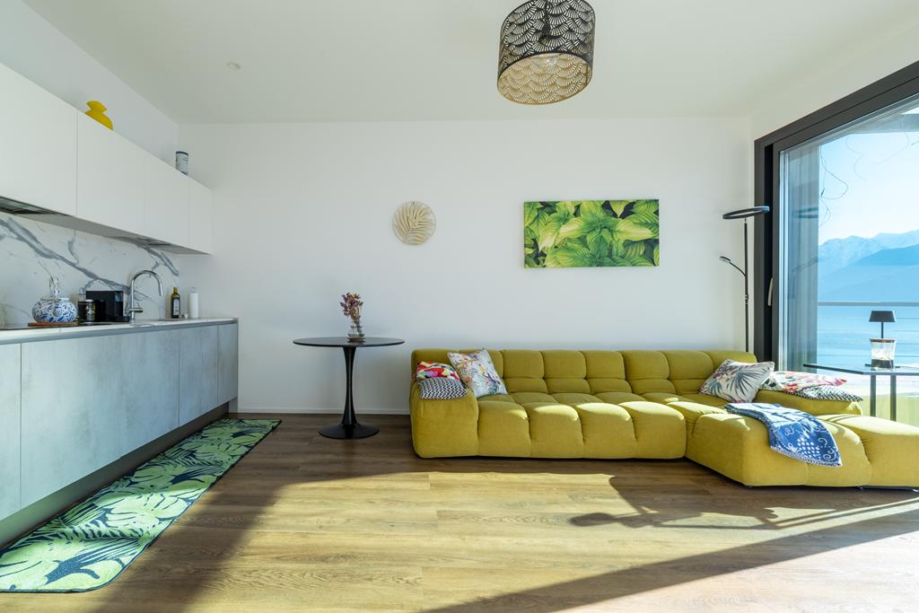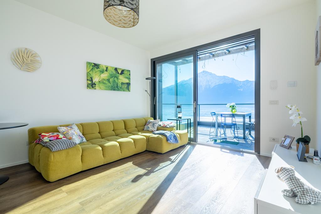 The property consists of a living area with open-plan kitchen, a large panoramic window overlooking the lake and the mountains, two bedrooms, and two bathrooms.